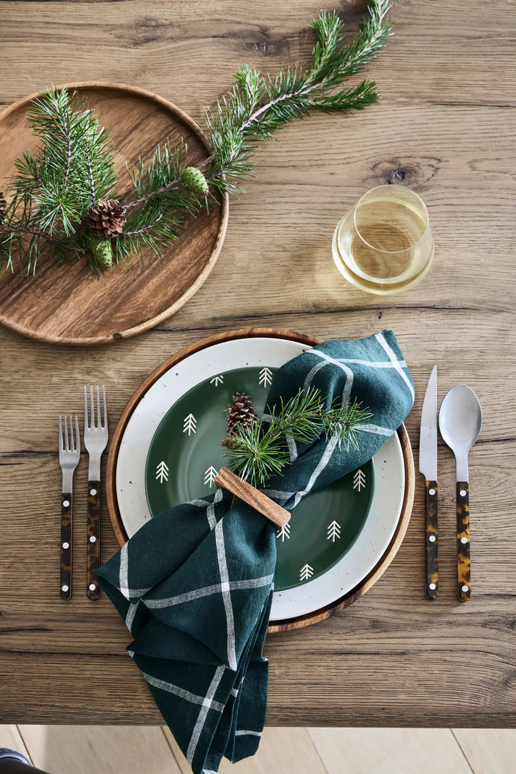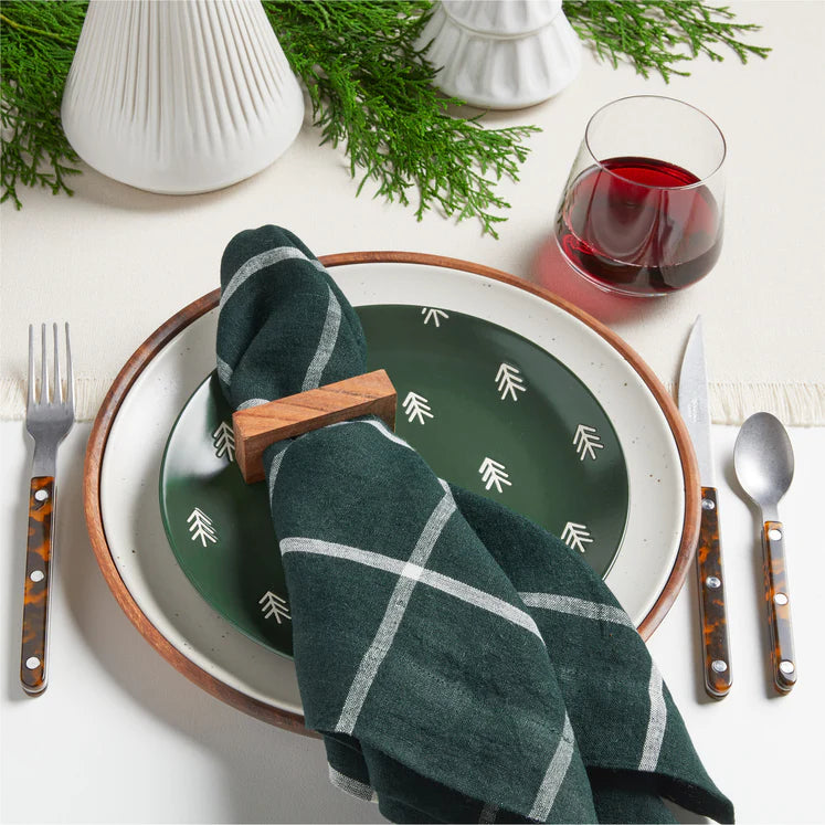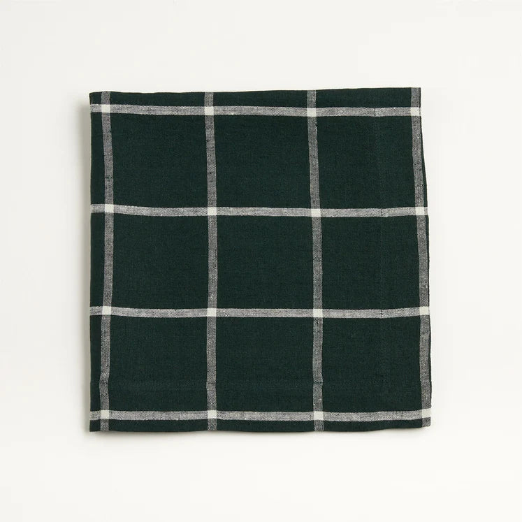 White lines weave an open windowpane plaid on our dark green Marin napkin. The sustainable linen napkin unfolds to a lavish 22-inch square with generous hems. Prewashed for extra softness, the machine-washable cloth is finished with mitered tailoring—diagonal seaming that creates crisp corners. Pair with the matching runner for a coordinated, and extra festive, table.