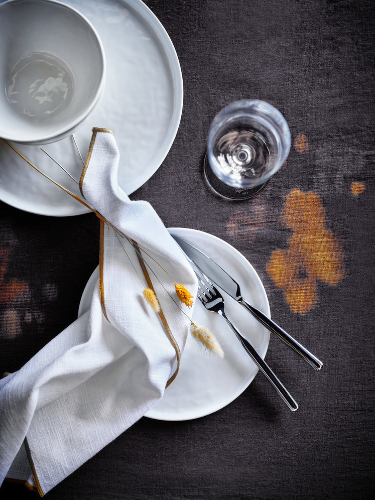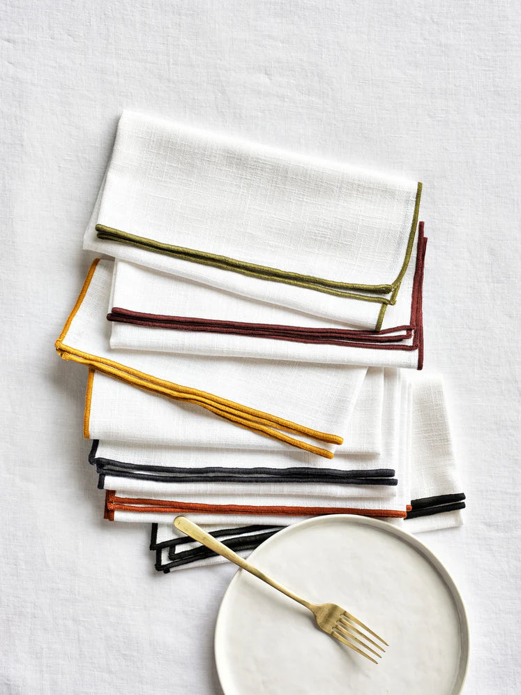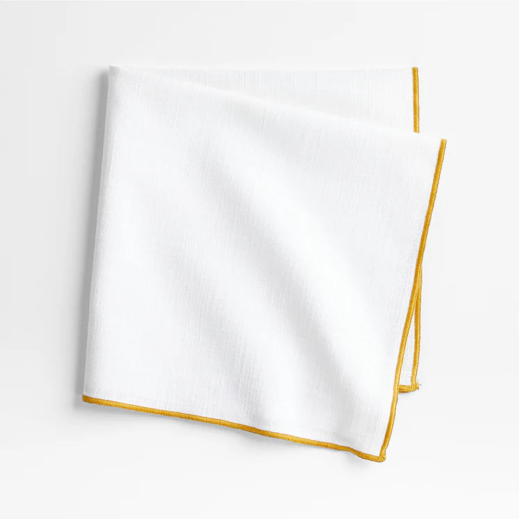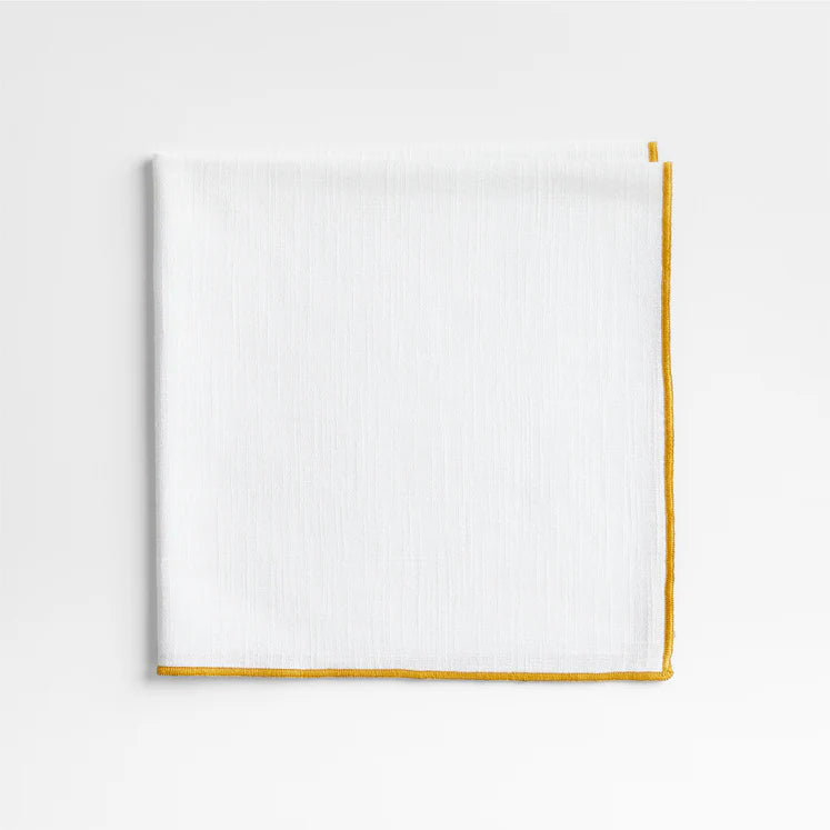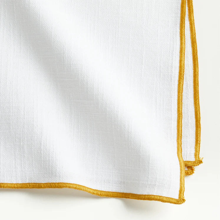 Mustard yellow embroidery frames our bright white Mercer napkins for a crisp look that elevates any table, no matter how casual. Beautifully tailored with an outline of dense merrow stitching, the slubbed organic cotton napkin unfolds to a generous 20-inch square. Pair the napkin with our colorful, black or white dinnerware—particularly our Mercer collection—to set a modern-yet-timeless table.