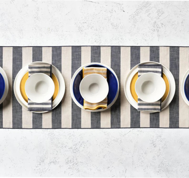 Yarn-dyed cotton in dark blue and natural taupe bands our Mercer napkin with heathered color and go-with-everything stripes. Blue merrow stitching along the edges of the wonderfully slubby weave lends contrast and keeps the look neat and tailored. Whether you're setting an alfresco table or indoor brunch, the striped cotton napkin brings a breezy vibe to any table.