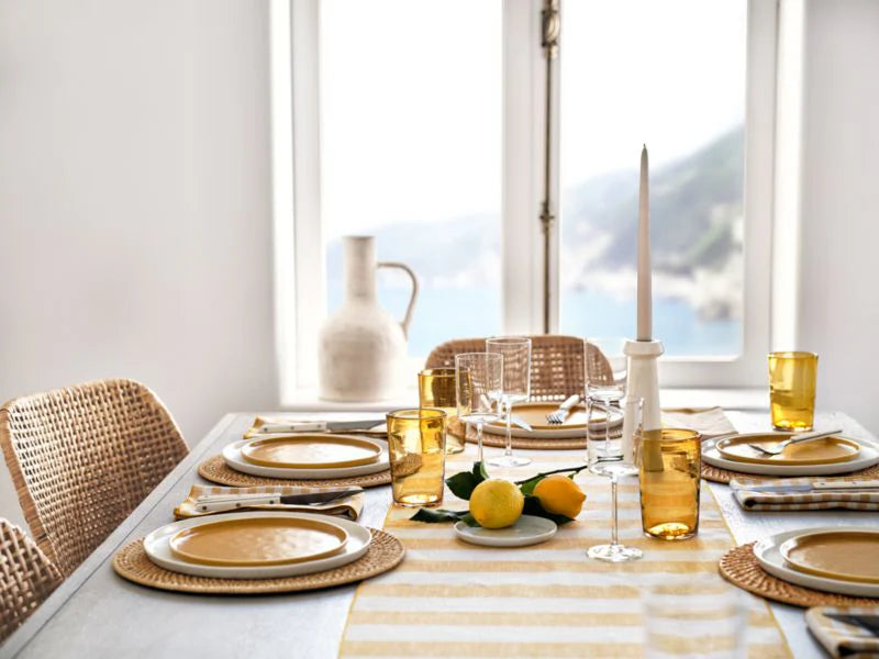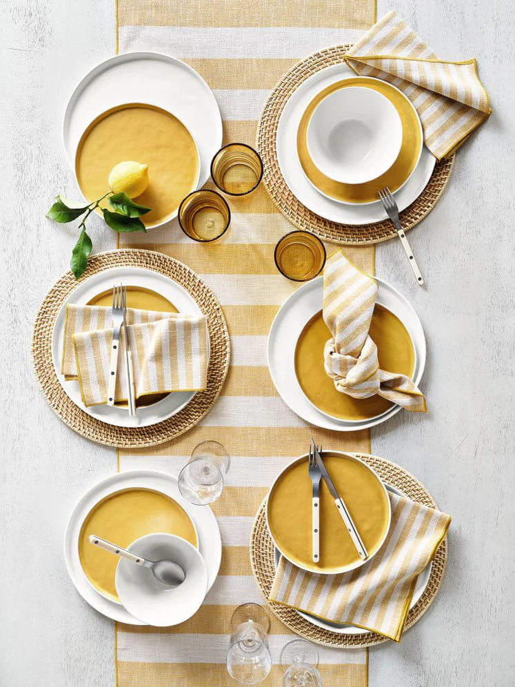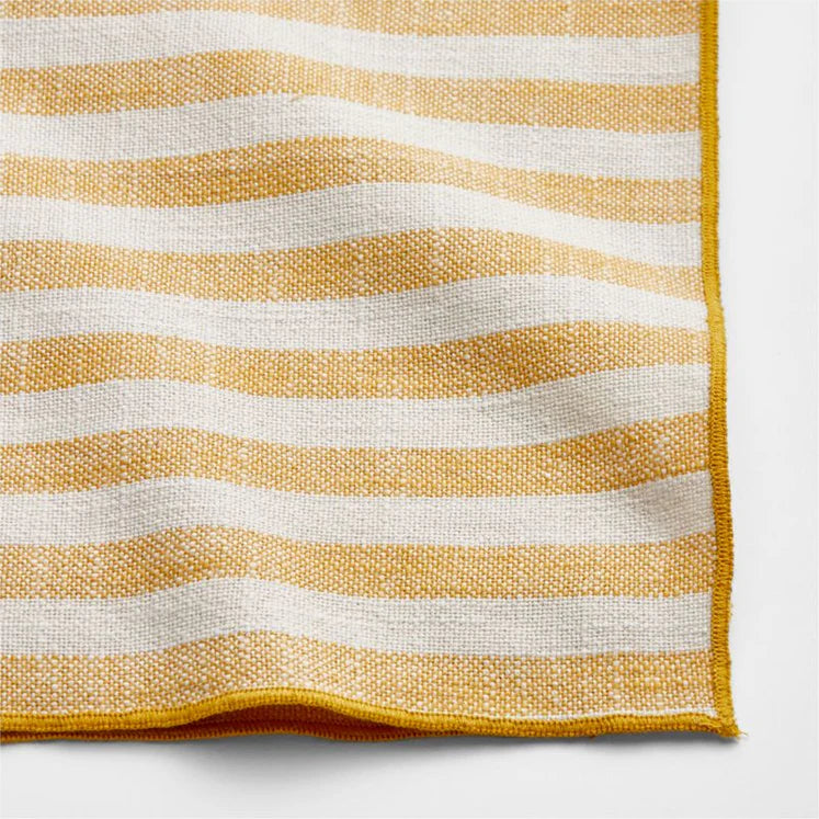 Yarn-dyed cotton in golden yellow and natural taupe bands our merrow stitch napkin with heathered color and go-with-everything stripes. Yellow merrow stitching along the edges of the wonderfully slubby weave lends contrast and keeps the look neat and tailored. Whether you're setting an alfresco table or indoor brunch, the striped cotton napkin brings a breezy vibe to any table.